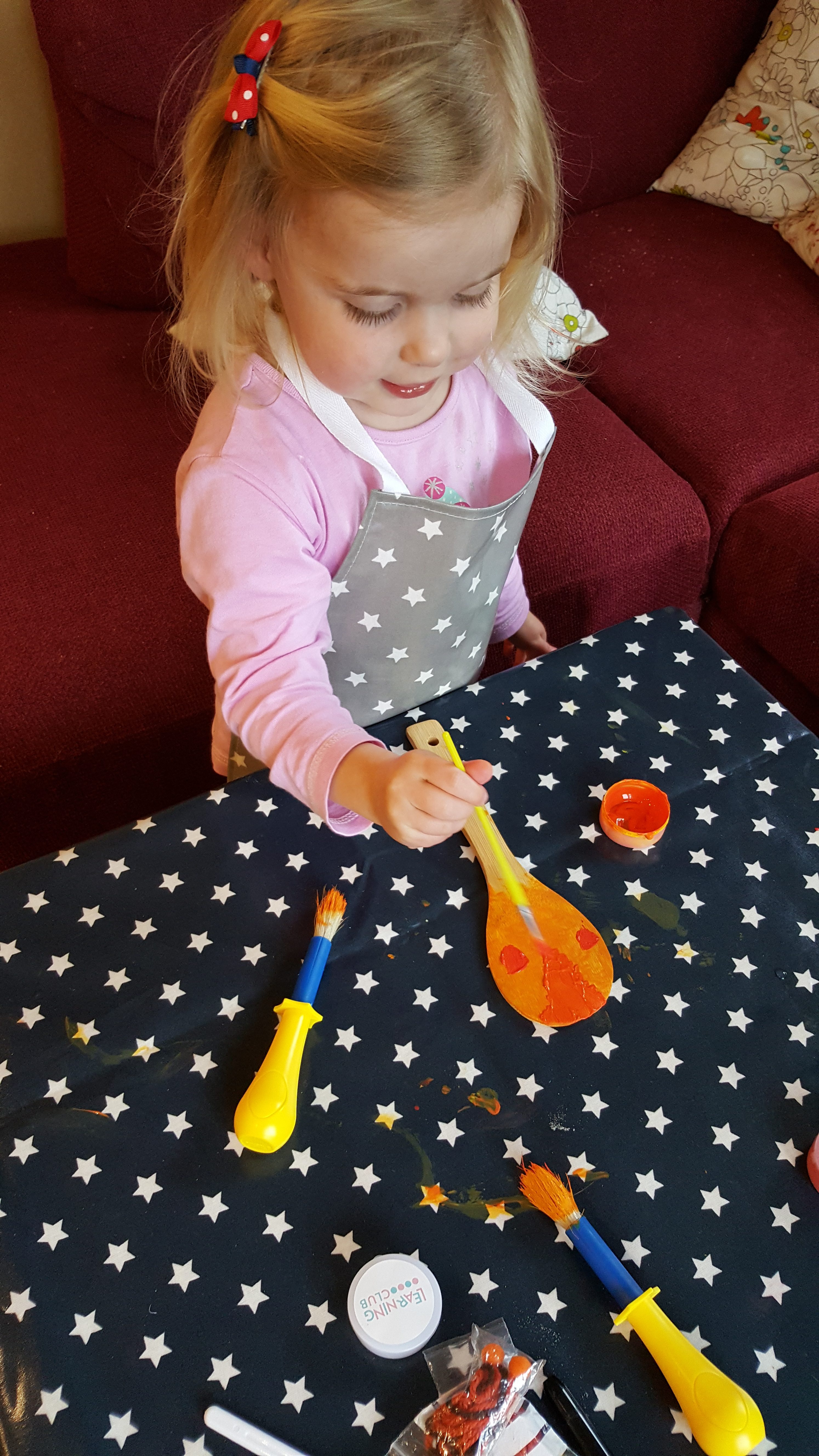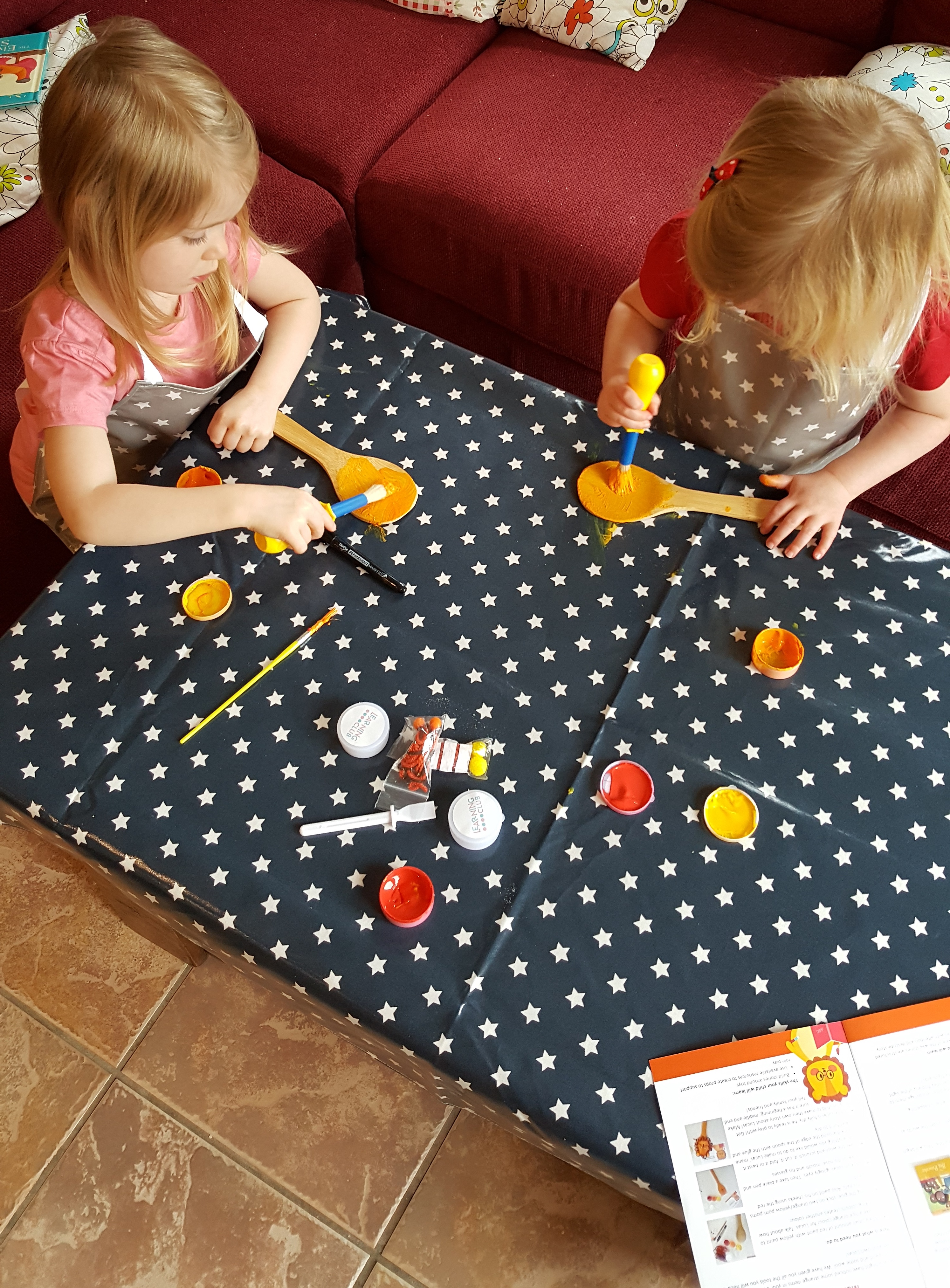 Also in the box we received a lovely hardback copy of ‘The Elves and the Shoemaker’. Again this was thrust into my hand to read immediately. I love the fact that there was a real mixture of activities and not all crafts. Emily is crafty like Mummy but Jessica gets bored with these kind of tasks much quicker. However Emily’s finished Lucus Lion wooden spoon puppet was popular. It’s a good job Emily is good at sharing.