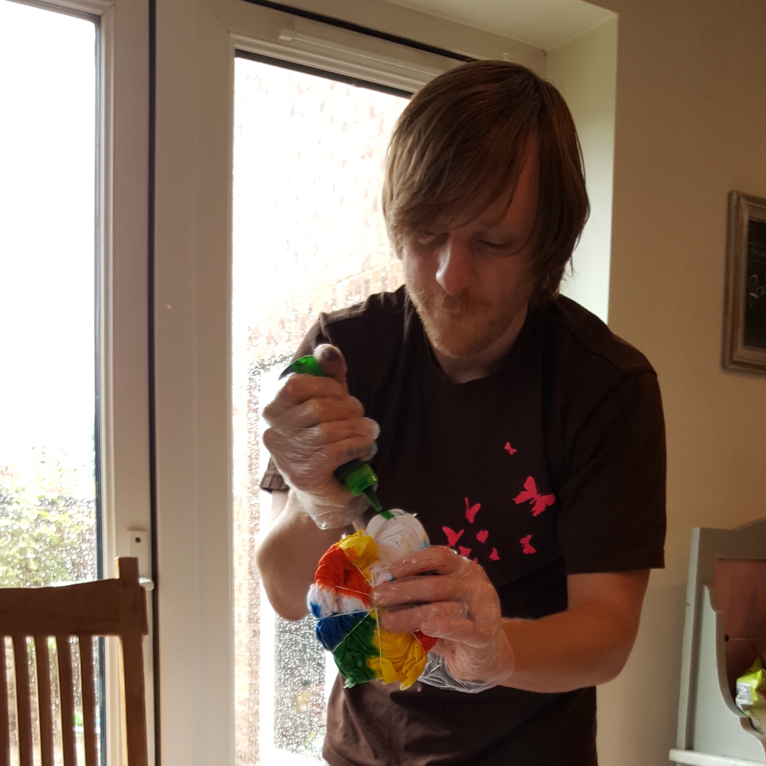 This year for Daddy2twindividuals’ birthday, he insisted he didn’t want anything. For the past few years, I’ve bought experiences rather than stuff. As we were away visiting family for the actual day, I picked up this cheap tie dye kit from The Works for a fiver. I knew he’d love the slightly creative, messy side of it and I thought it could be a fun family activity.