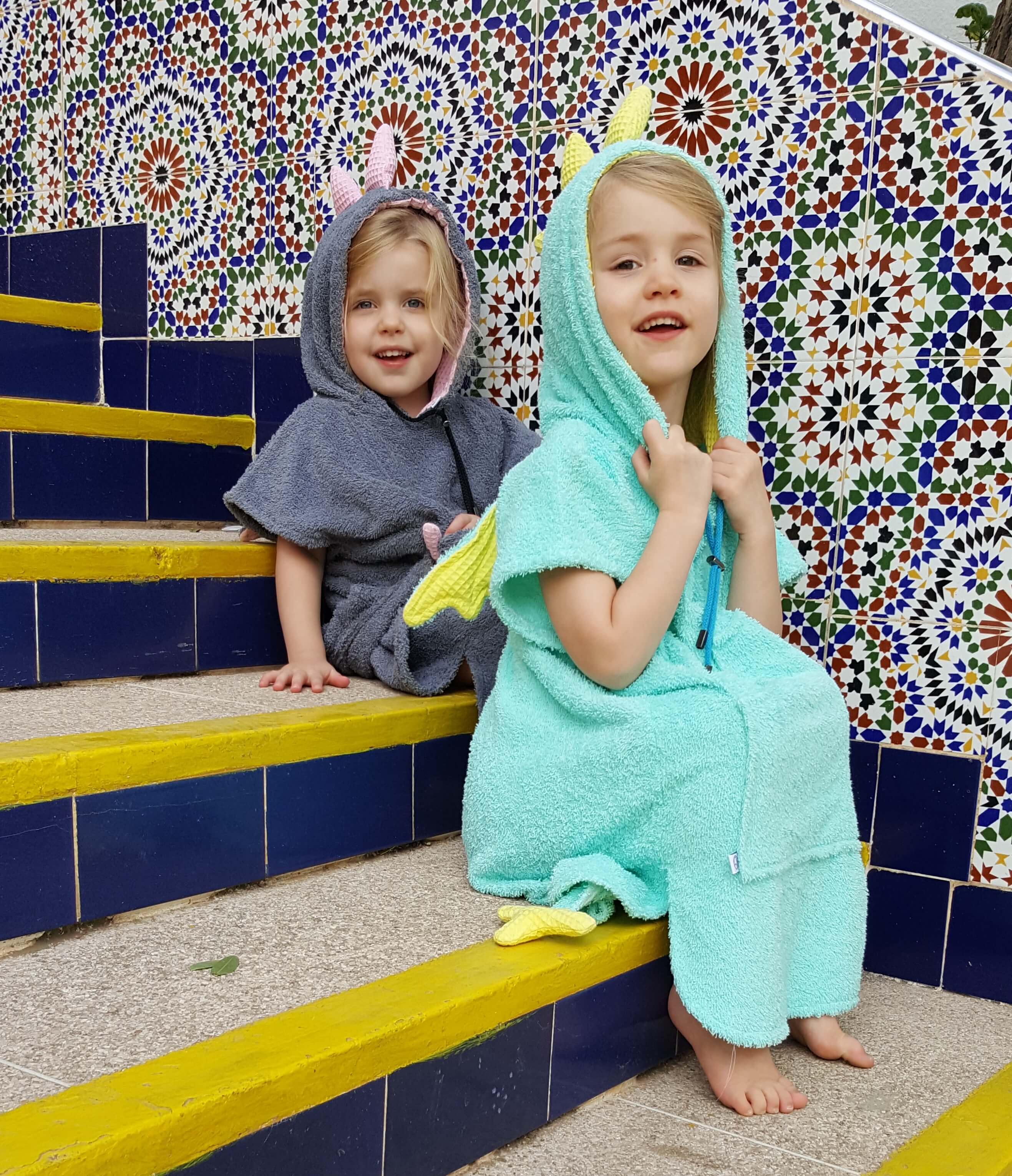 I’ve searched high and low for swim ponchos for the girls. We used their old ones loads after swimming or to cover up on the beach. But most brands just don’t make them big enough for 4 yr olds. Then I discovered Soncho Poncho. Isn’t the dragon design amazing?