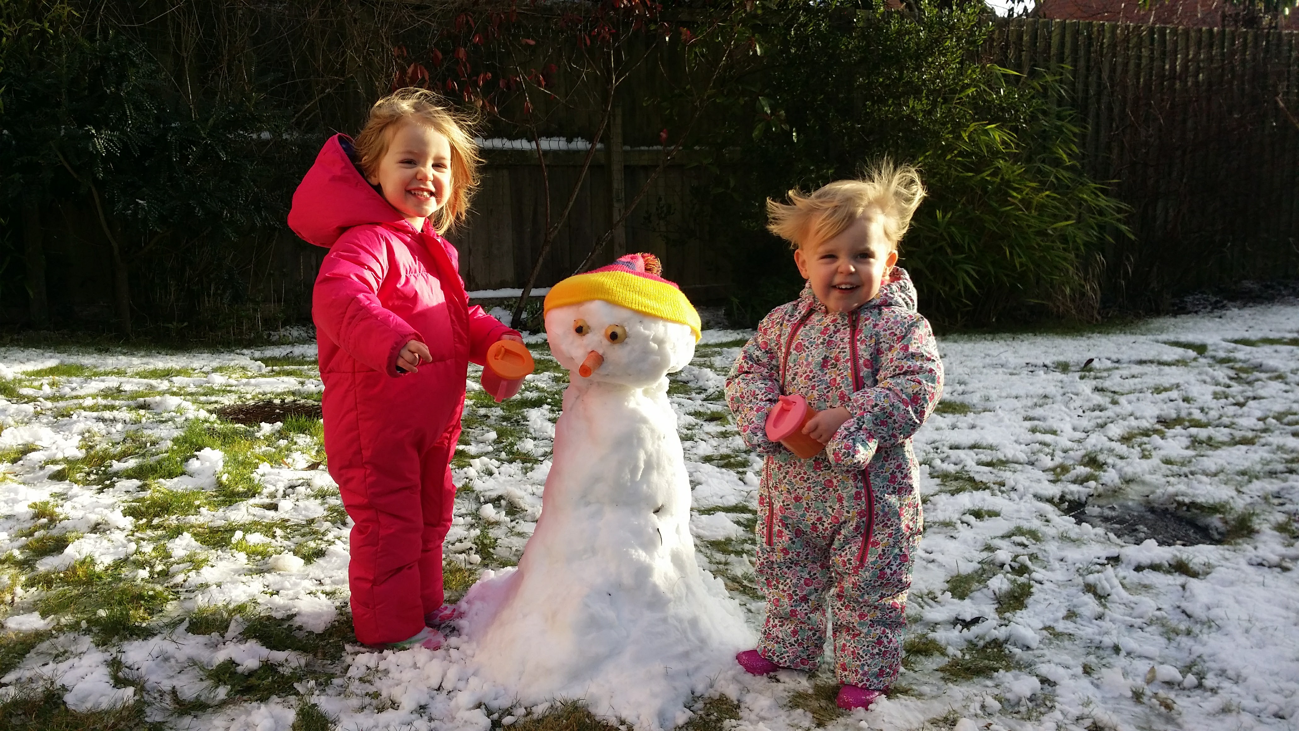 Daddy managed to sneak a quick breaks from his laptop and emails to help construct a little snowman. He wasn’t an overly grand fella but the girls loved him. Their first experience of snow and their first snowman was accompanied with weak hot chocolate… a very rare treat from this overly strict mummy.