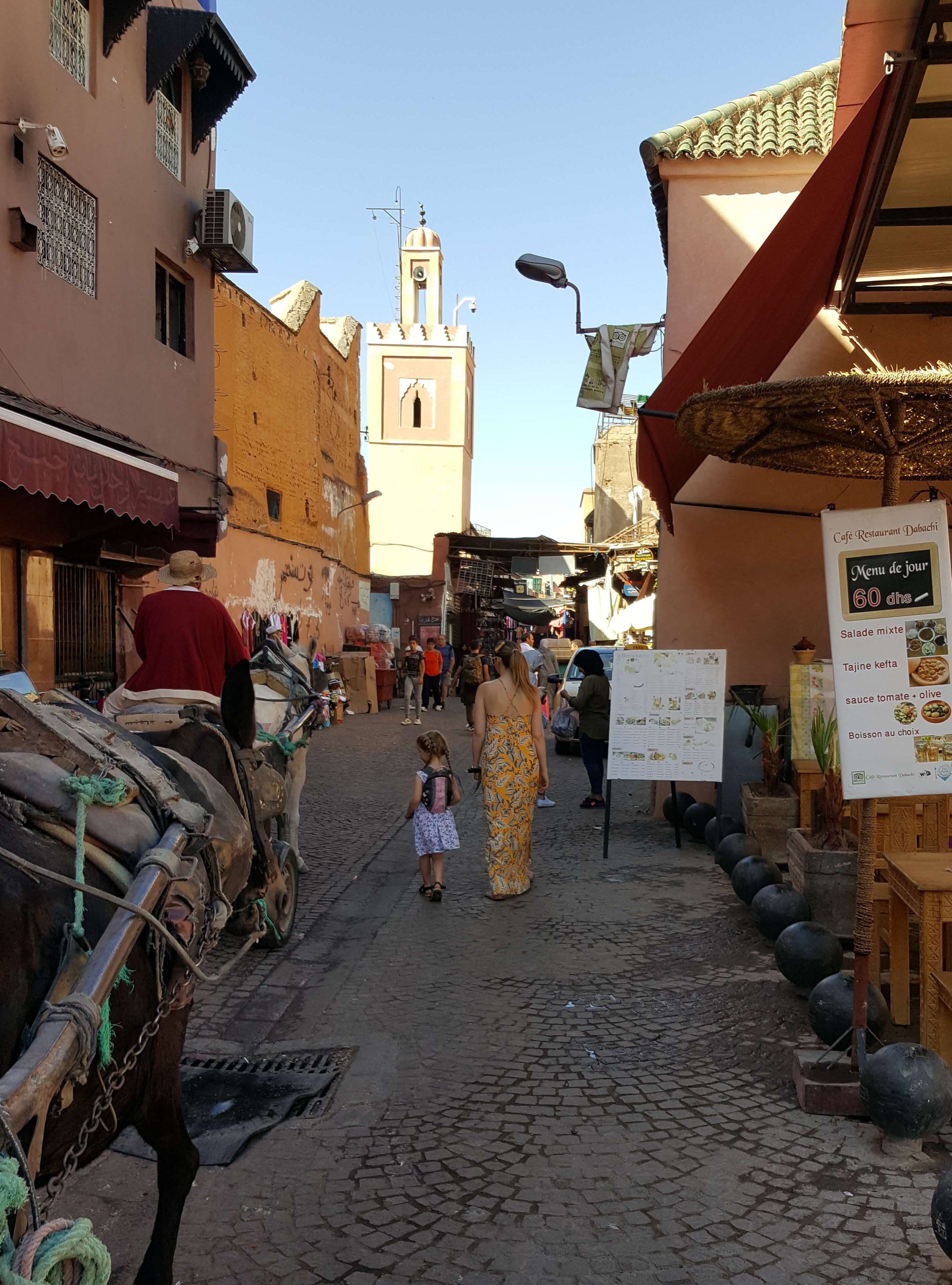 On our first full day we set off exploring towards the souks. The roads are bustling with donkey carts and motorbikes but we’d done some research so this didn’t come as a surprise. We’d packed backpack reins and I’m really glad we did as they gave us some added security and control over two inquisitive little ones. It was a very warm 30+ degrees so we took our time, kept hydrated and only planned short bursts of walking. At the end of each day we’d head back to the riad for a refreshing dip.