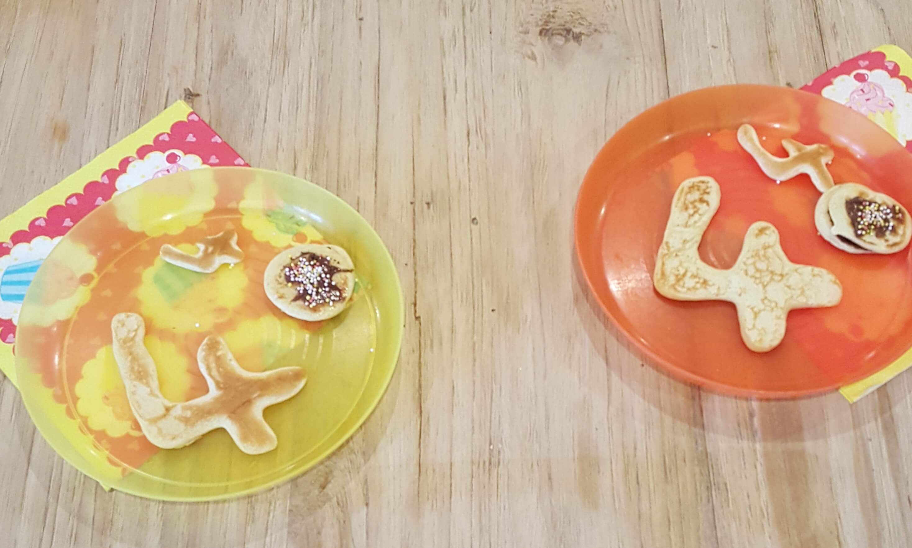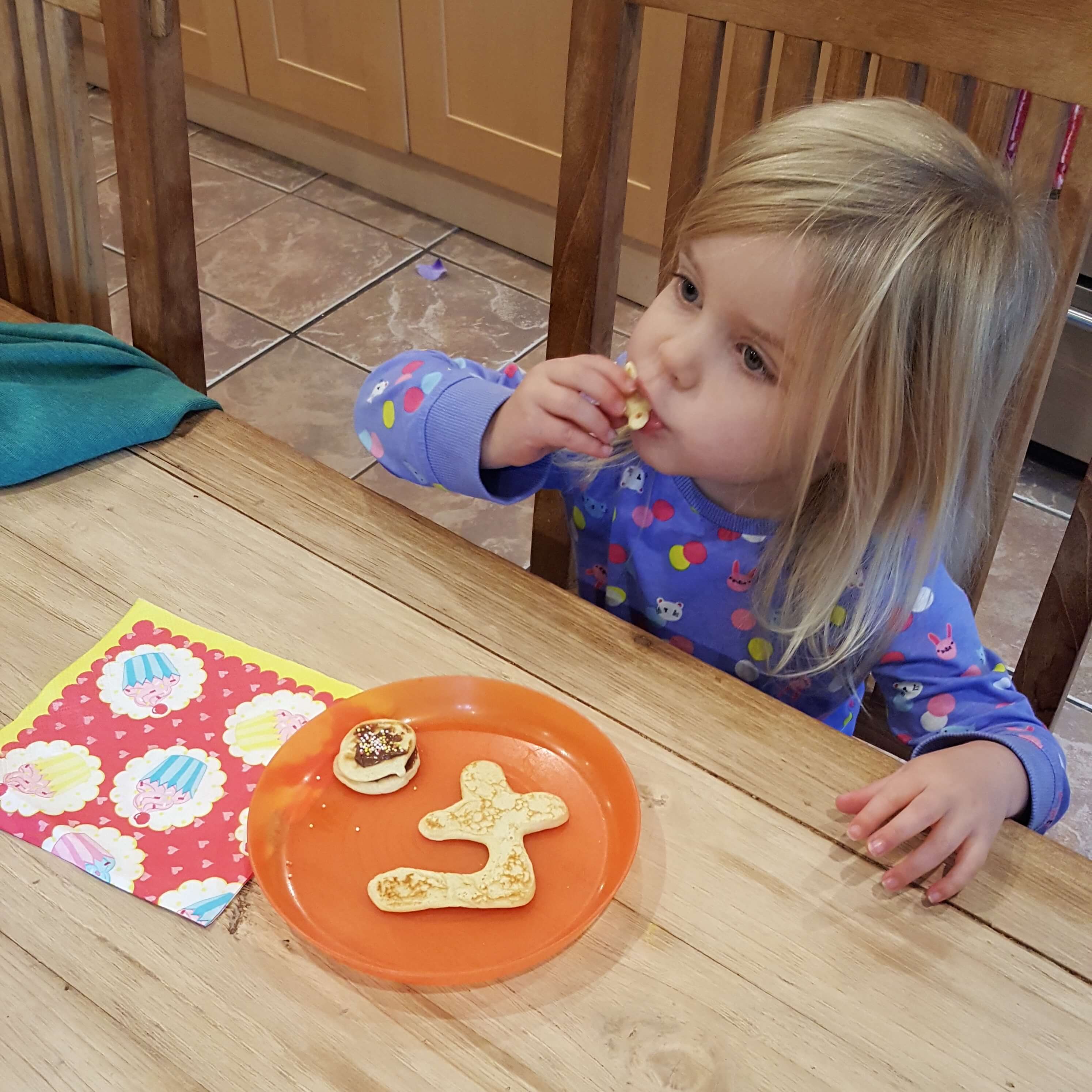 It took me quite a few attempts and it was a bit of a faff but these number pancakes really made the girls smile. I’d suggest a slightly thicker batter and to use a piping bag with only a tiny hole snipped off. With the extra batter I made mini circle pancakes which I then sandwiched with chocolate spread and topped with sprinkles. Mummy even had one. Delicious and definitely a birthday treat.