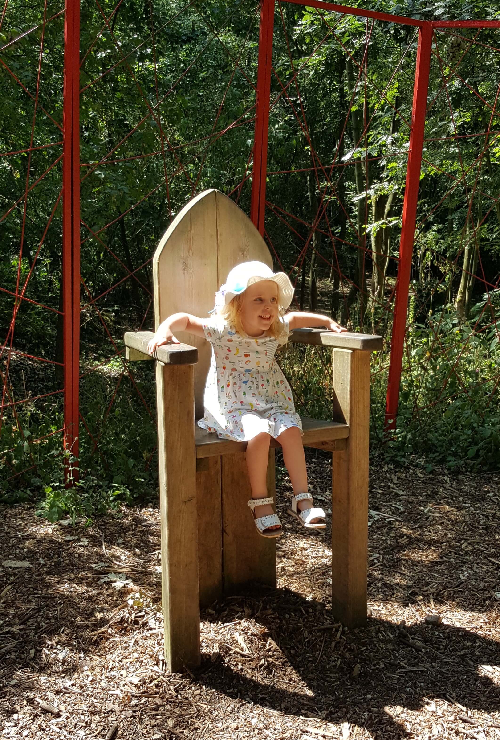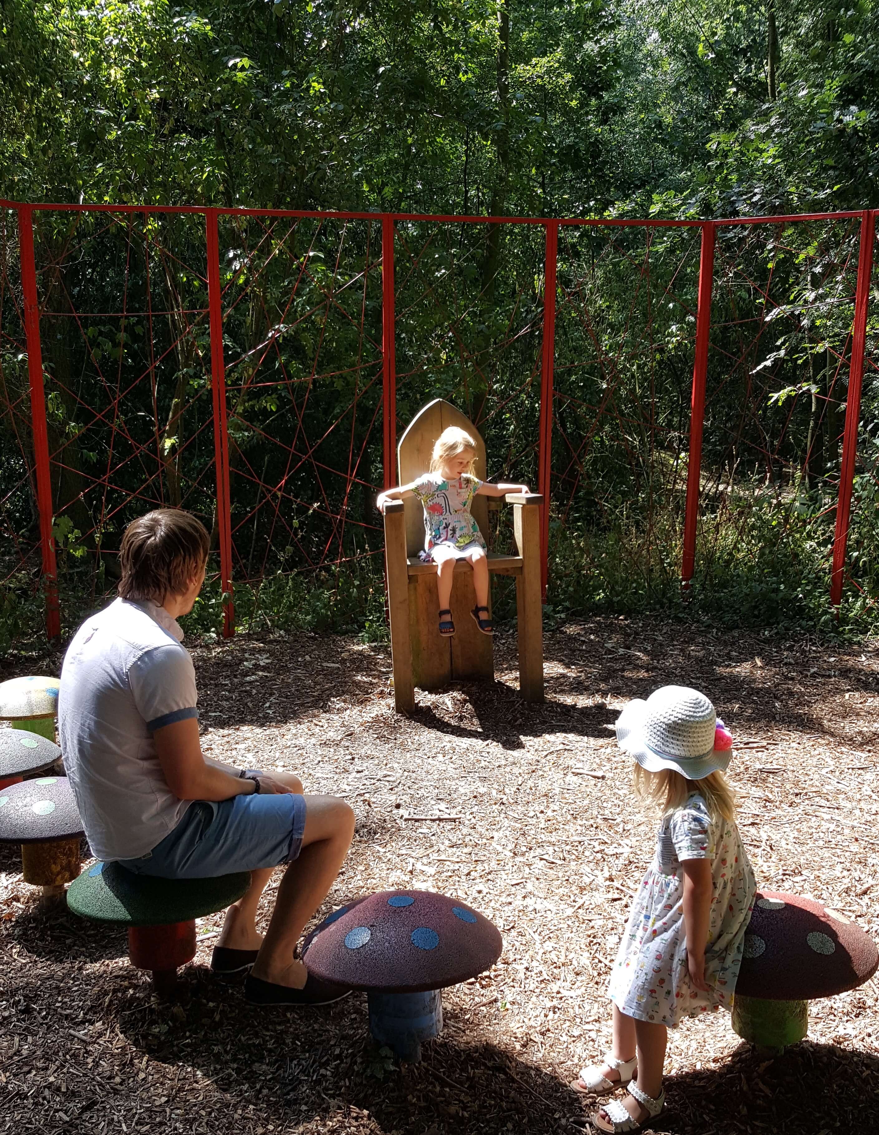 Along the way we discovered a throne surrounded by toadstools. I presume this is used for educational visit but it was fun to take turns sitting in the big chair telling stories. We crossed a small river to discover a lovely adventure playground. Separated into two section, there was play equipment for both toddlers and older kids.