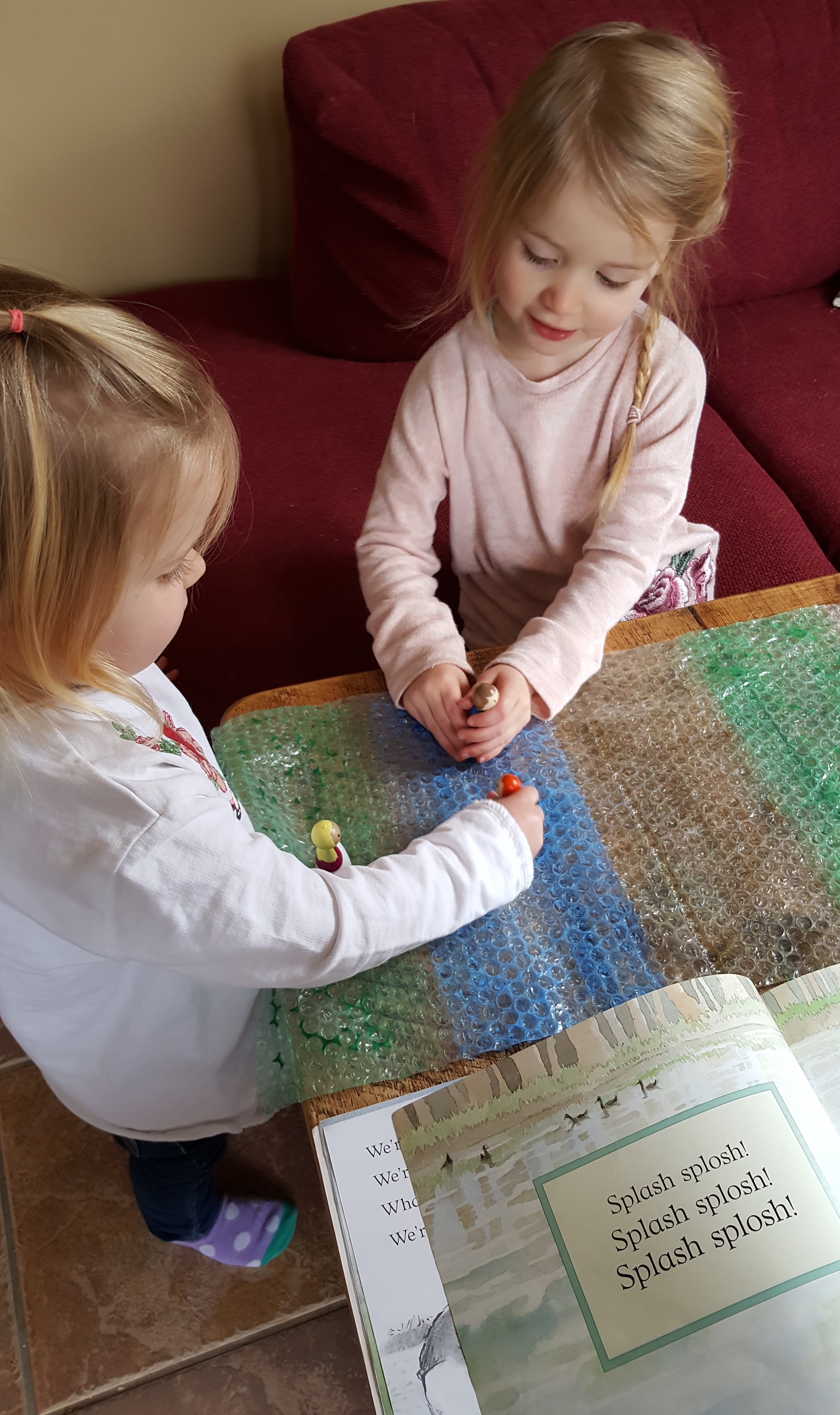 “Repeats words and phrases from familiar stories” – Anyone who has read ‘We’re going on a bear hunt’ will know the whole story is based around repetition. Even without the toys, my girls would sing along the repeated passages. However with the peg dolls they used more expression and seemed to join in as the characters.