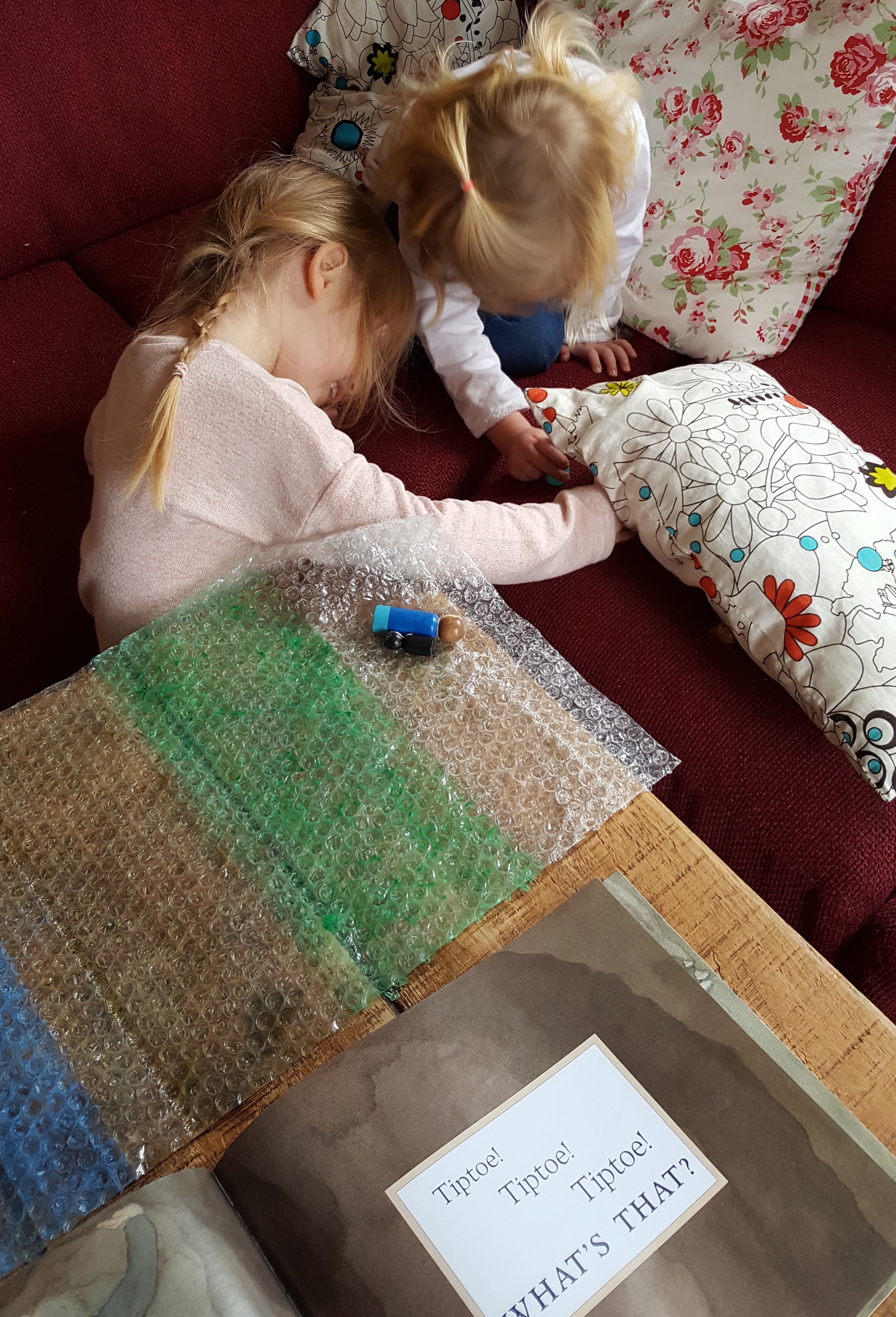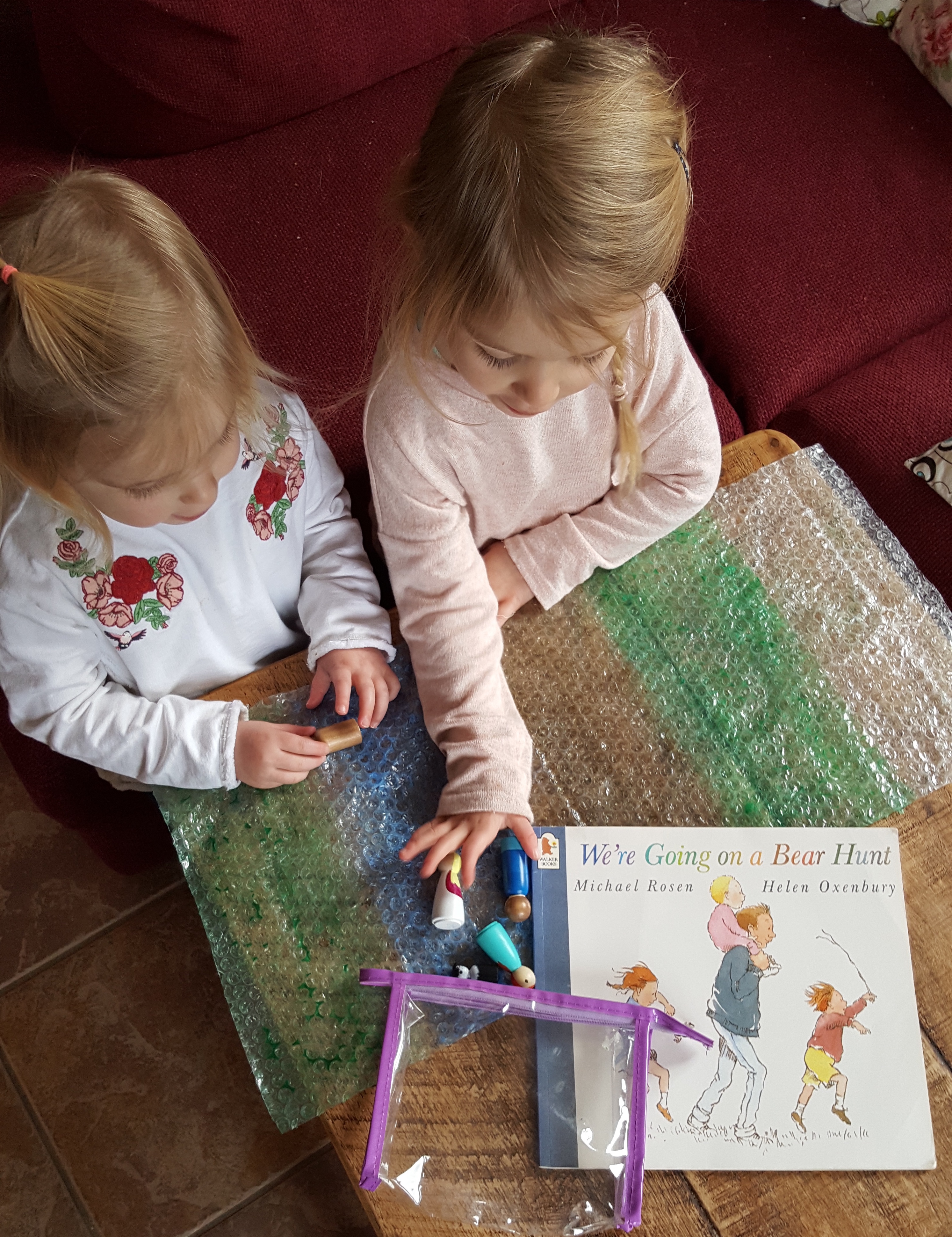 “Uses vocabulary and forms of speech that are increasingly influenced by their experience of books” – With their peg dolls they can try out the descriptive vocabulary such as squelching through the mud, stumbling through the forest or splashing through the river. We made a simple play mat by painting some old bubble wra. They loved taking the characters through on their journey to find the bear.
