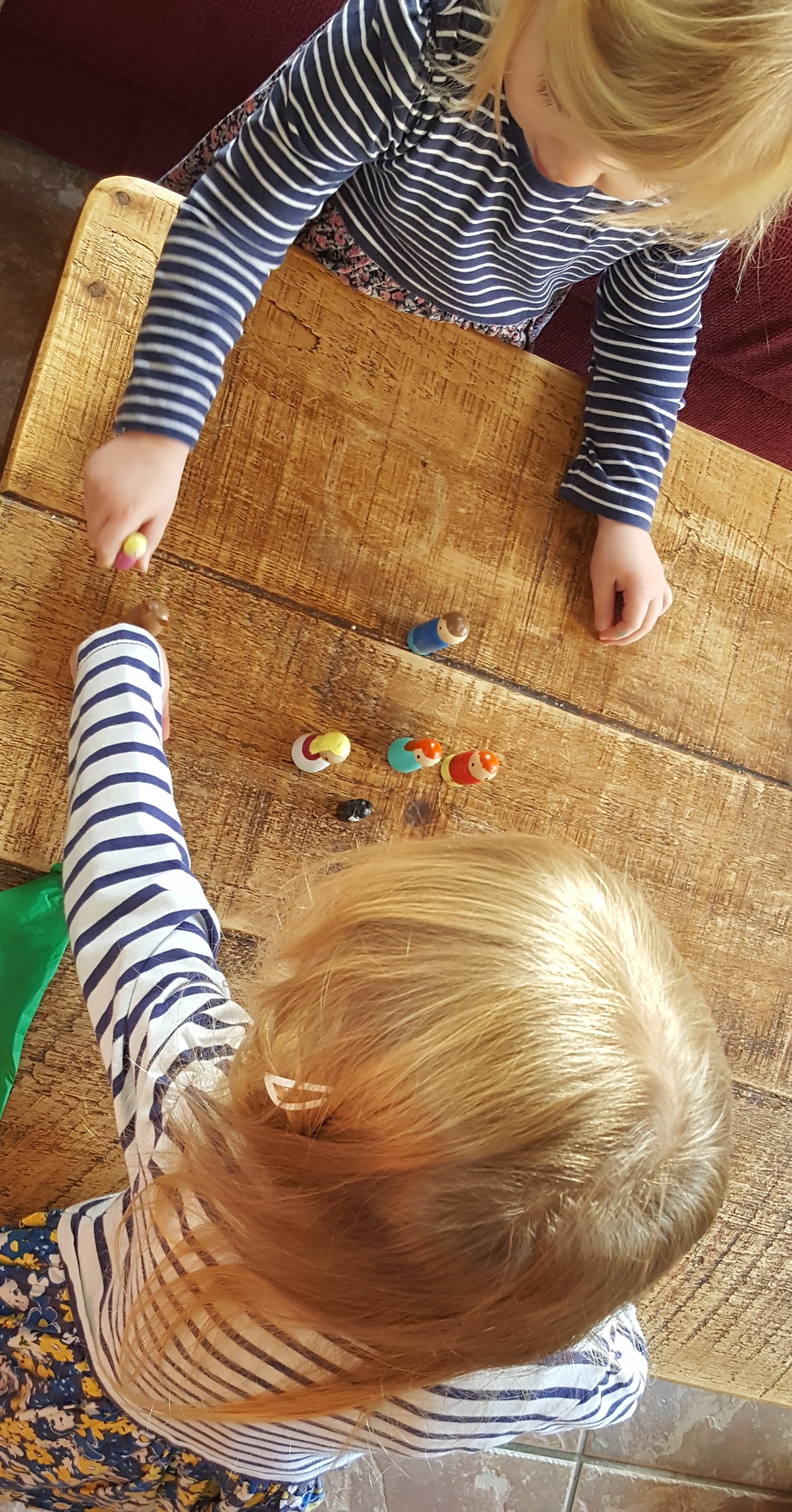 “Beginning to make believe by pretending” – By providing interesting items for my girls to play with I’m sparking their imagination. This encourages them to pretend these little wooden pegs are actually people.