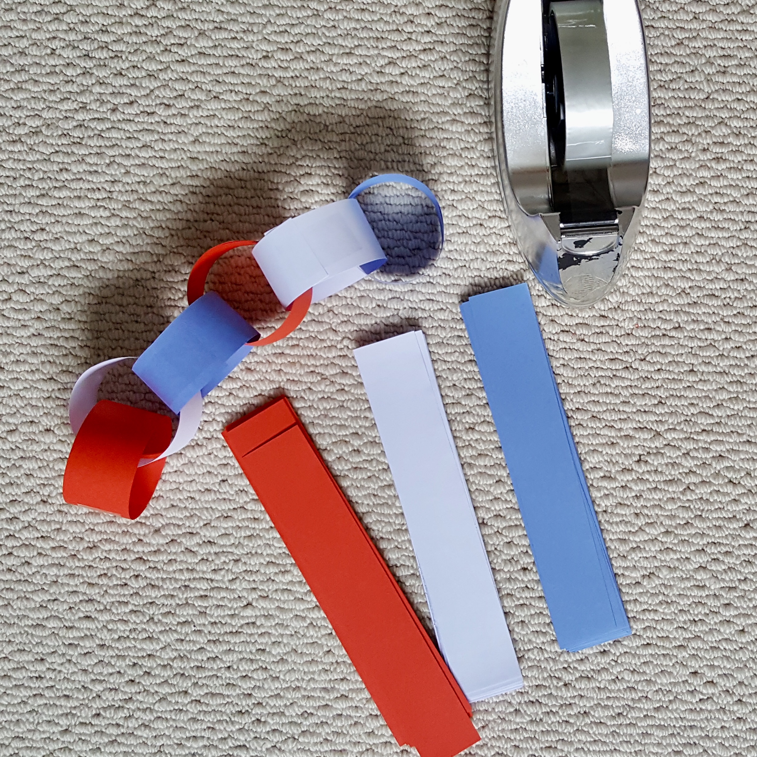 You can’t have a party without decorations so I’m going to give them a load of red, white and blue paper strips and let them go to town creating paper chains. Tape is probably safer than letting toddlers lose with a stapler so a mass of tape to keep them going and let’s see what they create.